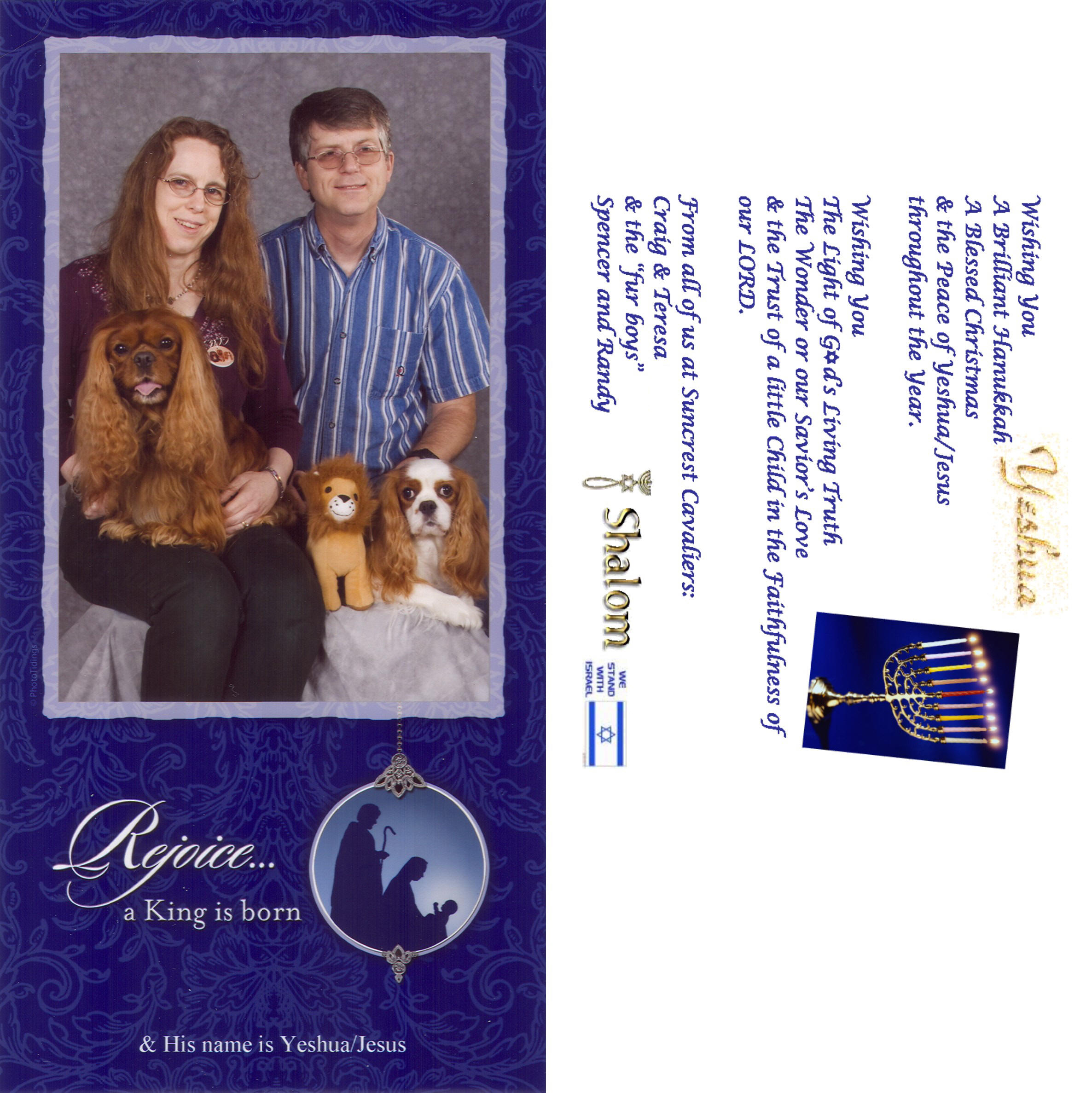 This is our 2007 Hanukkah/Christmas/New Years Card. The photo was taken in July 2007 at the Indianapolis CKCSC Show. Mummy says this is not a very good photo of daddy and her because they look tired and stressed, but it is only showing the truth (they are tired and stressed). It has been bit of a rough year for all of us.
